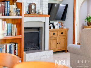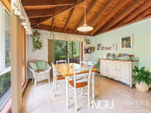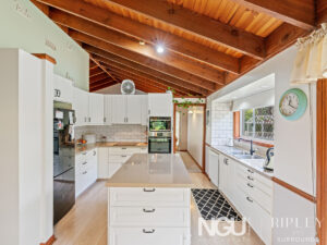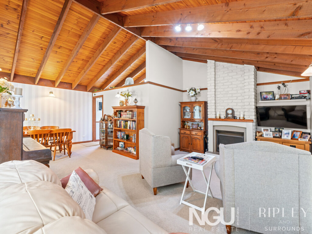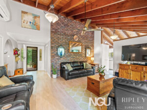 Inside, the home unfolds with warmth, character and architectural interest. High timber-pitched ceilings elevate the main living areas, creating a sense of space and light, while an exposed brick feature wall adds texture and timeless appeal. A built-in fireplace, with rear venting into the main living zone, forms a natural gathering point during cooler months, reinforcing the home’s relaxed, lodge-like atmosphere. Timber-look vinyl flooring flows through the kitchen, dining and living areas, grounding the interiors in a coastal-inspired palette that complements the surrounding greenery.